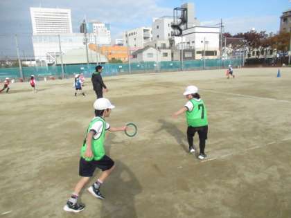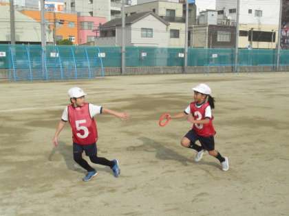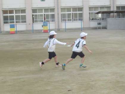 リレーをしました。バトンをもらう時のスタートを練習しました。