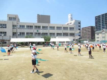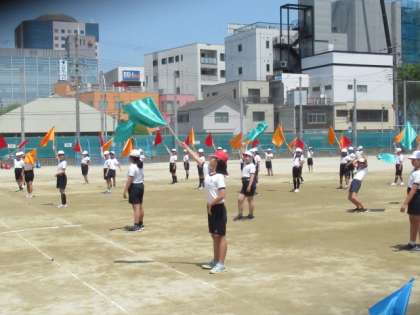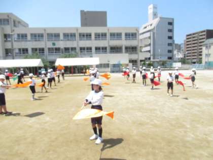 体育大会の練習をしました。フラッグの動かし方や移動の練習しました。