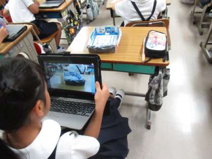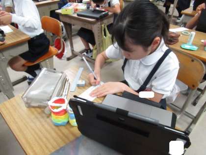 「カラフルねん土でマイグッズ」を作りました。作品の名前や工夫したところなどを書きました。その後、タブレットで撮影をしました。