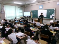 学校の絵を描きました。先生から描き方のコツを聞いています。