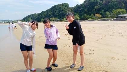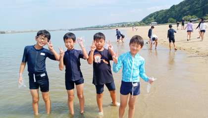 水遊びをしたり、明日のシェルメモリーに使う貝殻を探したりしています。