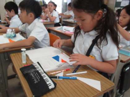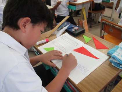 できた三角形の特徴を調べました。折り紙を使い確認しました。