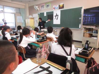 毛筆で「力」と書きました。書き方のポイントを聞いています。