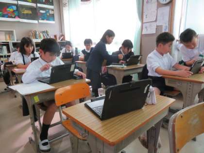 「工芸品のみりょくを伝えよう」の学習です。パソコンを使って、リーフレットの作成を進めています。