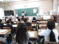 「市」の書き方の説明を聞いています。その後、プリントをしました。