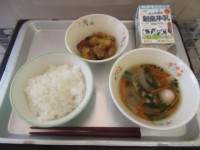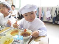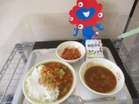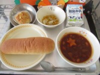 今日の給食の「ビーンズシチュー」にラッキーにんじんが入っています。楽しくおい...