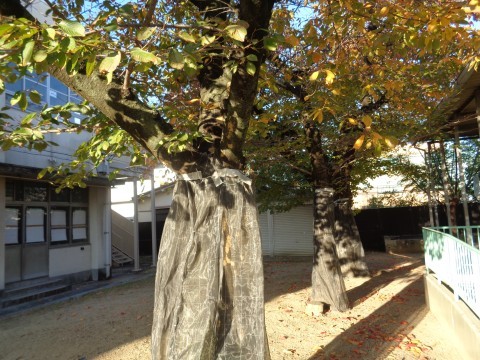 桜の木に害虫予防をしていますが,虫がついているところもあります。