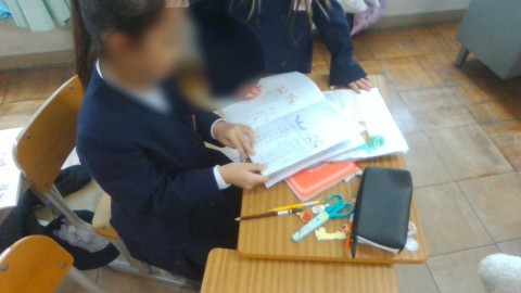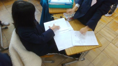 国語で,お話を作りました。完成した作品を見せ合っています。
