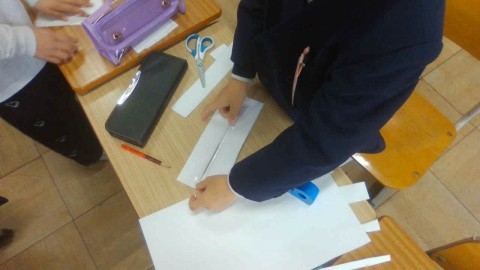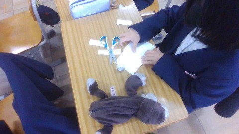 前回写し取った箱の面を切り取り,箱の形になるように組み立てました。同じ長さのへんどうしをつなげればいいんだね。