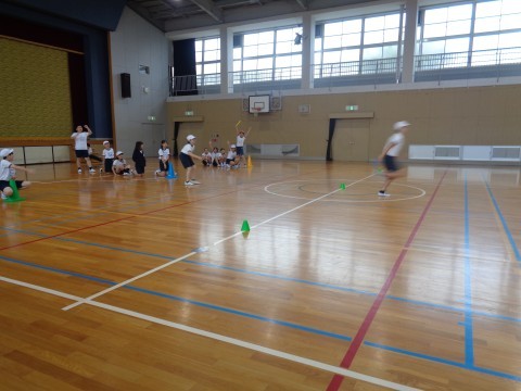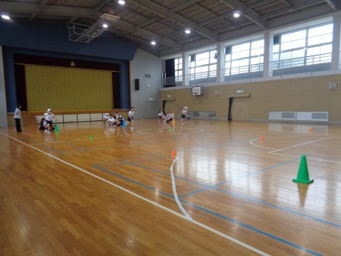 リレーをしました。途中でケンケンが入ったり,走ったりといろいろなバージョンで競いました。黄色チームが速かったようです。