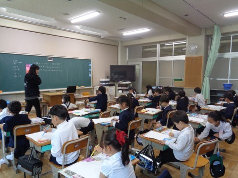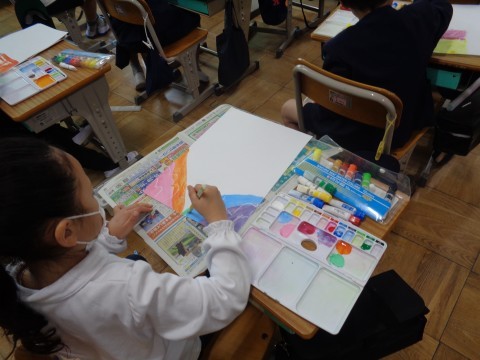 前の時間に白色のクレパスで,画用紙に模様を描きました。今日は,いろいろな色の絵の具を使って,上から色をつけました。そうすると,白色のクレパスの模様が浮かんできました。クレパスと絵の具のステキな組み合わせ方を発見できましたね!