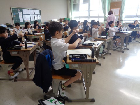 初めての毛筆の授業がありました。筆でまっすぐ線やぐにゃぐにゃ線を書いてみました。これからもよい姿勢で,筆を立てて書きましょう!