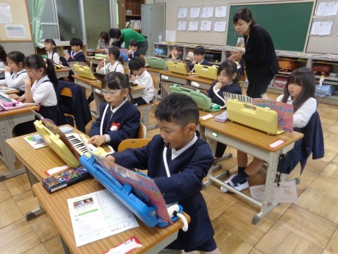 「あそぼ」の曲で,ドとレの音を出す練習をしました。何度も何度も繰り返し,練習していました。いろいろな曲が弾けるようになるといいですね。