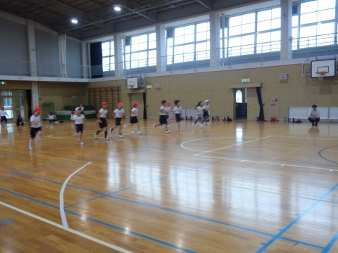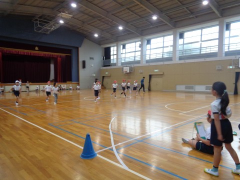 シャトルランをしました。3人1組になって,記録を取りました。最後まで残って走っている人に「頑張れ~」と声援を送っていました。