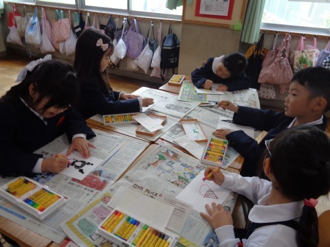 クレパスで,好きなものをたくさん描きました。好きなキャラクター花,動物と,友だちとお話しながら,楽しく活動していました。
