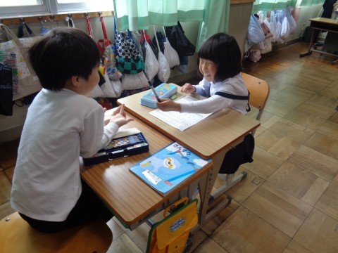 クラスの係の仕事について相談しながら,ポスターを書きました。友だちと協力し,責任をもってお仕事をしましょう。