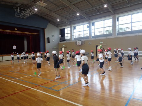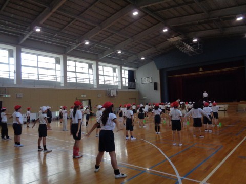 体育大会の団体演技の練習がありました。速いテンポの曲に合わせて,しっかり動いていました。
