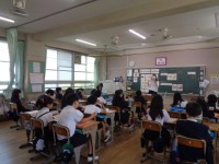 国語の授業です。「漢字の形と音」について学習しています。「求」「球」「救」のように,「同じ部分で同じ音」の漢字を調べています。