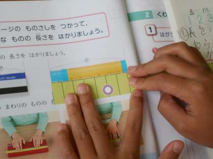 算数の授業です。「cm」の単位の学習をしました。「紙ものさし」で長さを測っています。