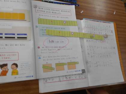 算数の授業です。「cm」の単位の学習をしました。「紙ものさし」で「1cm」を確認して,長さを測っています。