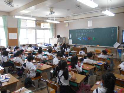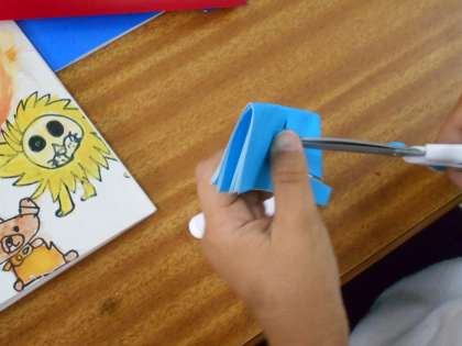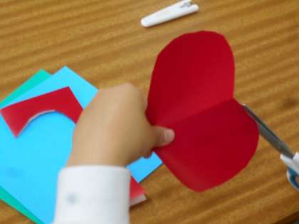 図工の授業です。折り合わせた色紙を切って,かざりをつくっています。