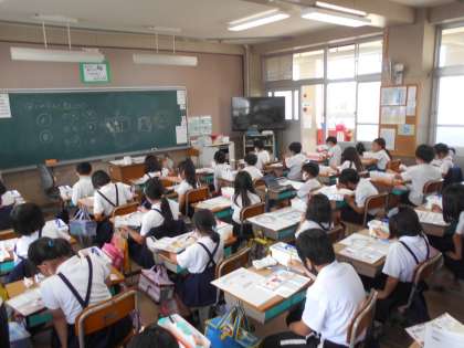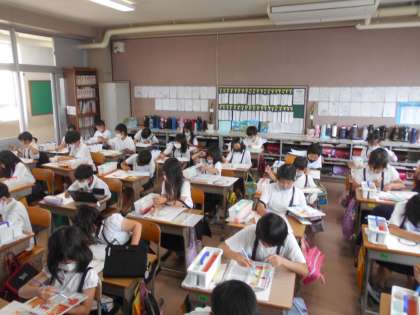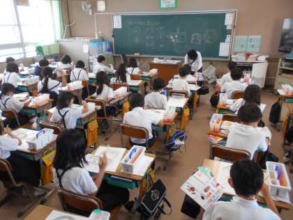 図工の授業です。「自画像」を描いています。色の出し方が難しそうです。