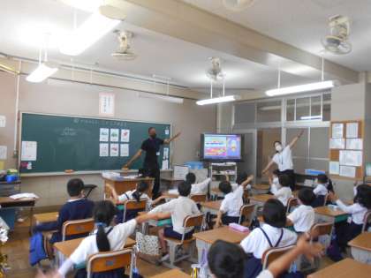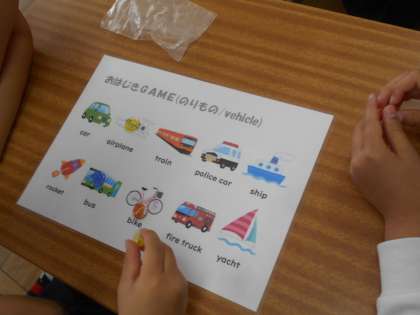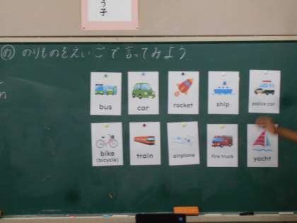 ジャロン先生といっしょに,「乗り物」を英語で言っています。