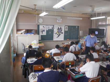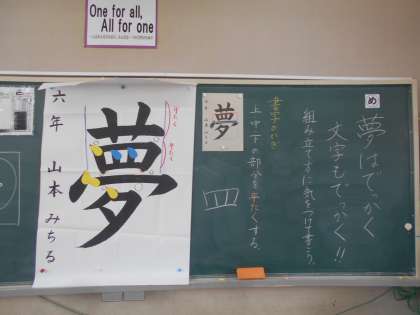 書写の授業です。「夢はでっかく 文字もっでかく」。「夢」を書いています。