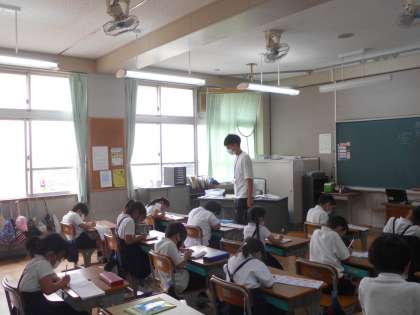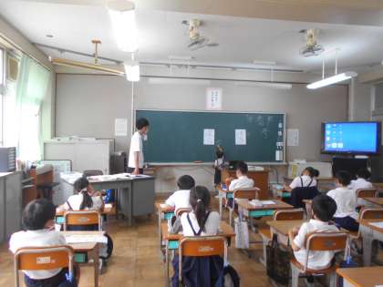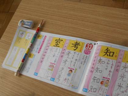 国語の授業です。新出漢字の「考」「室」の練習をしています。