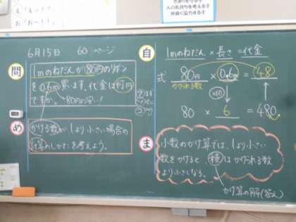 算数の授業です。小数のかけ算で「かける数が1より小さい場合」どうなるのか,考えています。
