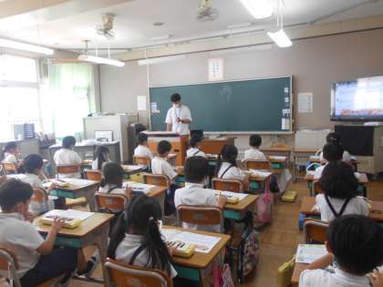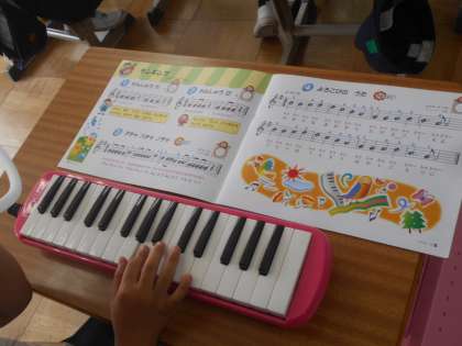 音楽の授業です。「タンギング」の練習をして,「アチャパチャノチャ」を演奏しています。