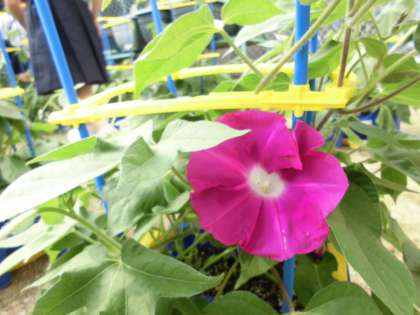 早くもアサガオの花が咲きました。花が咲いた子は「めっちゃきれい!」と喜んでいました。次はどんな色の花が咲くのか楽しみですね。