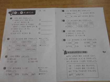 算数の授業です。「1000までの数」の復習プリントに取り組んでいます。