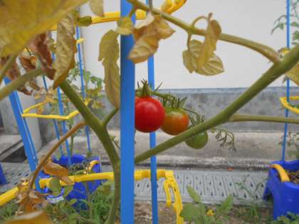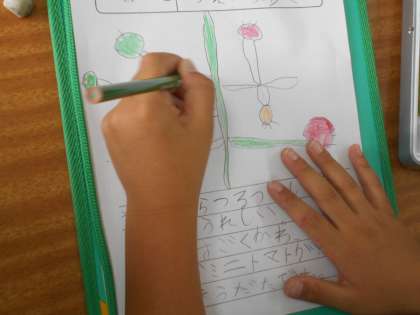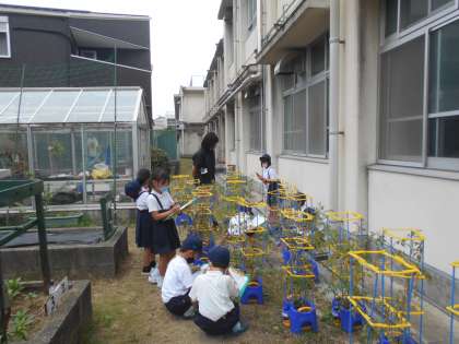 生活科の授業です。「ミニトマト」の観察をしています。赤く色づきはじめました。