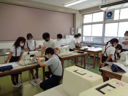 家庭科の授業です。ミシンを使って,ナップザック作りに取り組みました。