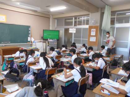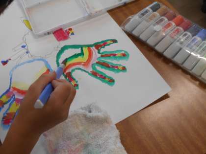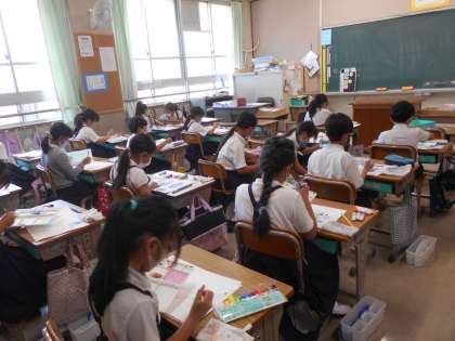 図工の授業です。自分の手の形取り,色を塗っています。何が完成するのか楽しみです。