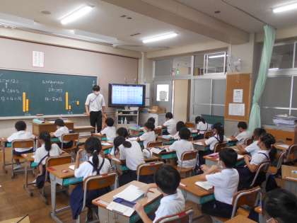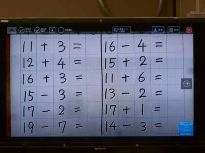 算数の授業です。「10より大きくなる たし算とひき算」の練習問題をしています。