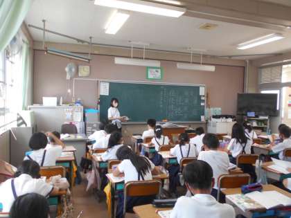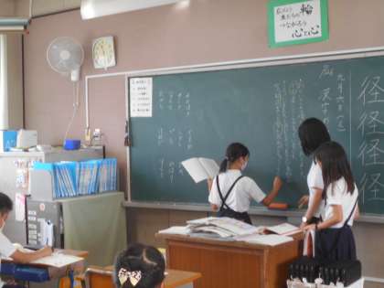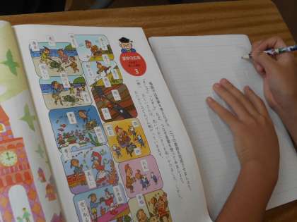 国語の授業です。「漢字」を組み合わせ,「つなぎことば」を用いて文章をつくり,昔むかし話を完成させます。