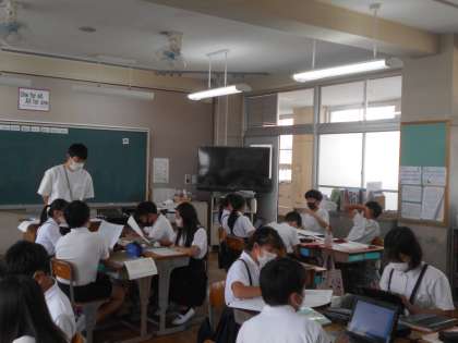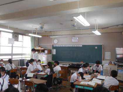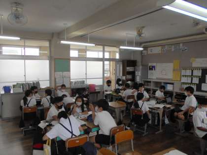 国語の授業です。「環境問題」について,「私たちにできること」グループで考えています。