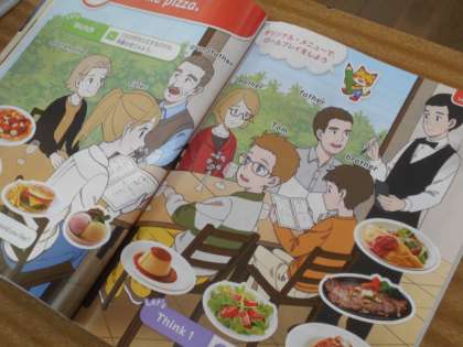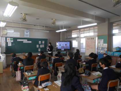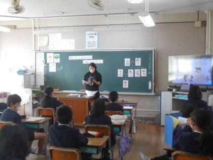 外国語の授業です。「father」「mother」「brother」「sister」など,家族の表し方について,学習しています。