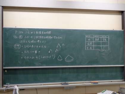 理科の授業です。ふりこが1往復する時間の変わり方について調べました。