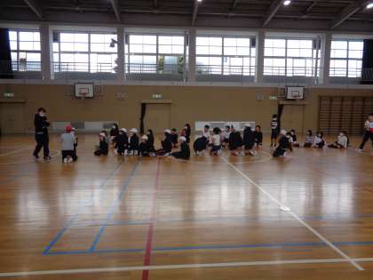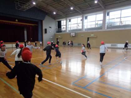 体育の授業です。鬼ごっこをしながら体力を高める運動に取り組みました。