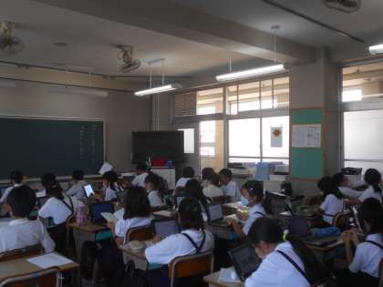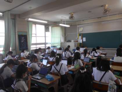 国語の授業です。「みんなが過ごしやすい町」にするためには何が大事なのか、タブレットで調べています。