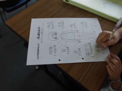 今日は、韓国語で体の部分の言い方について学習をしました。同じ読み方だけど発音の仕方で区別したり、同じ言葉だけど、ちがう意味ももつ言葉がある話をしました。