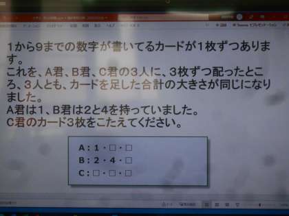 算数の授業です。計算や測定ではなく、「数学的な考え方」を養う問題に挑戦しています。