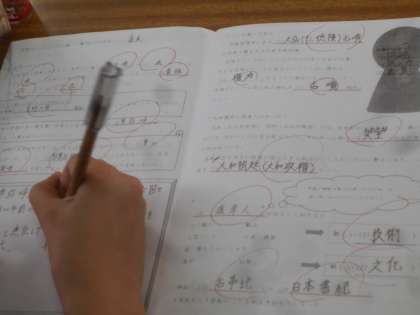 社会の授業です。タブレットの映像から、「卑弥呼」の時代についてまとめています。