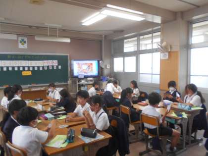 外国語活動の授業です。トランプを使ってゲームをしながら、英語の数字を覚えています。