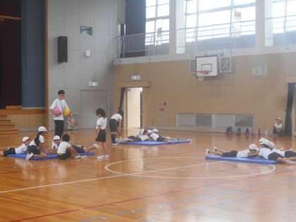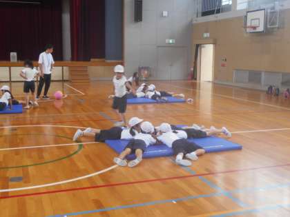 体育の授業です。ゲームをしながら、マット運動に取り組んでいます。
