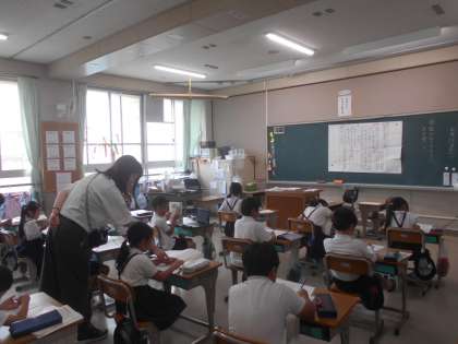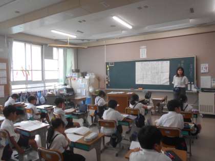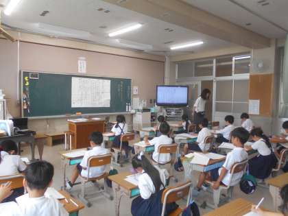 国語の授業です。昨日、タブレットでまとめた題材をもとに、作文を書いています。