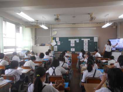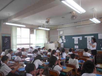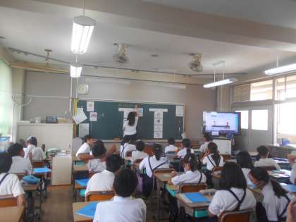 外国語の授業です。「I have 〜 」「I sutdy 〜 」の学習をしています。